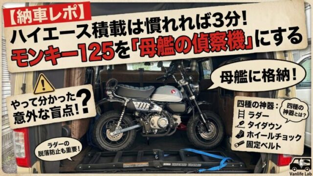 カーライフ 【納車レポ】ハイエース積載は慣れれば3分!モンキー125を「母艦の偵察機」にする四種の神器と、やって分かった意外な盲点 2026年3月9日 hohoge ついにこの日がやってきました。ホンダが誇るレジャーバイクのアイコン、モンキー125(2025年モデル:パールカデットグレー)の納車日です。 …