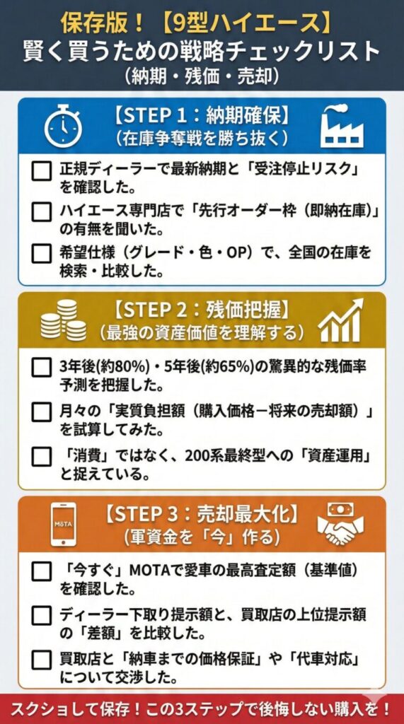 次期300系で噂されるセミボンネット化により、「短い全長で最大級の荷室」という黄金比は、この9型が最後になるかもしれません。この歴史的な転換点において、後悔しない選択をするためには、これまでの「ディーラー任せの買い方」を捨て、戦略的な立ち回りが求められます。