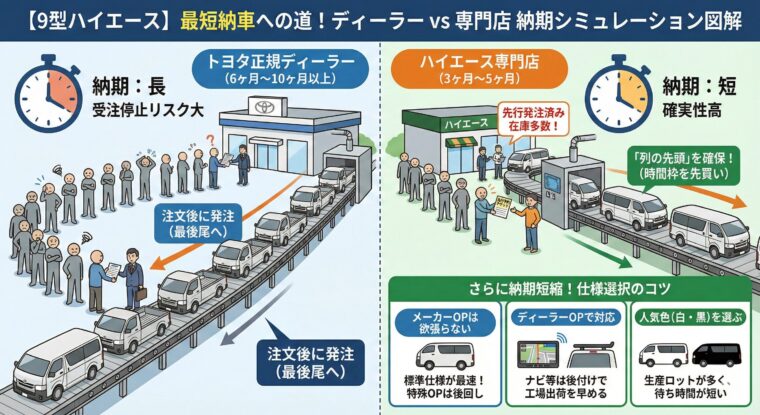 一般的には「正規ディーラーが一番早いはず」と思われがちですが、ハイエースに関しては逆転現象が起きています。その理由は、専門店が「B2B(業者間)の先行投資」を行っているからです。