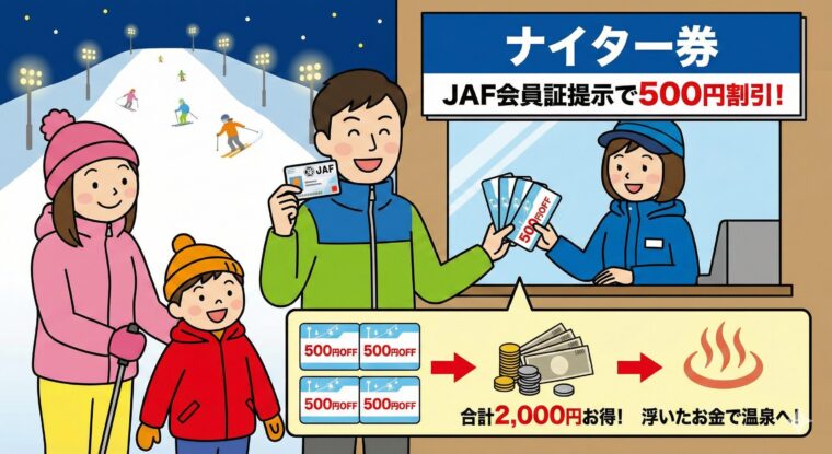 • 窓口でJAF会員証を提示するだけ! ふじてんのナイターリフト券は、JAFの優待特典で500円割引になります。これ、意外と見落としがちなのですが、夜の時間帯でもしっかり適用されるんです。
