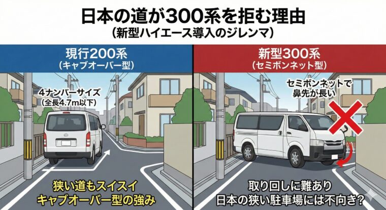 海外で先行発売されている300系ハイエースは、衝突安全基準を満たすための「セミボンネット構造」を採用しています。しかし、これが日本国内、特に我々のような都市部住まいのユーザーにとっては大きなハードルとなります。