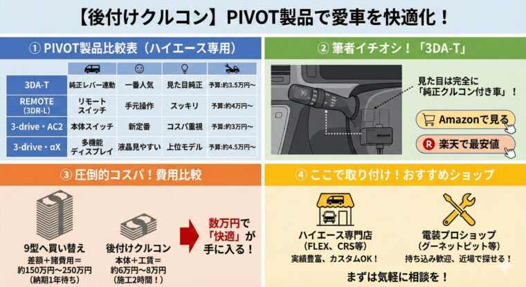 ハイエースの後付けクルコン市場において、圧倒的なシェアと信頼性を誇るのが国産メーカーのPIVOTです。製品ラインナップが豊富なため、「どれを選べばいいか分からない」という方に向けて、主要モデルを比較表にまとめました。