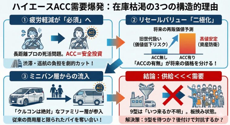 彼らは「ACCがある生活」に慣れきっており、「クルコンがない車は検討対象から外れる」という強い拘りを持っています。この層がハイエース市場に流入したことで、従来の商用車ユーザーとの間で限られた在庫の奪い合いが発生しているのです。