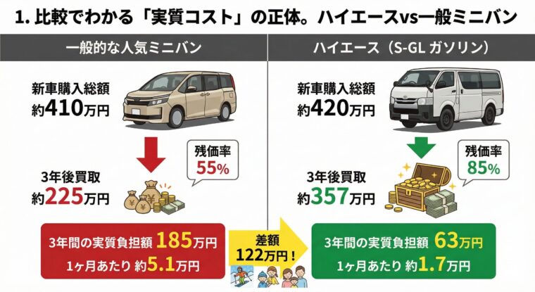 しかし、一人の会社員として「購入価格」ではなく「売却価格との差(実質コスト)」を徹底的に計算したとき、衝撃の事実に気づきました。ハイエースは、一般的なミニバンよりも圧倒的に「家計に優しい車」だったのです。