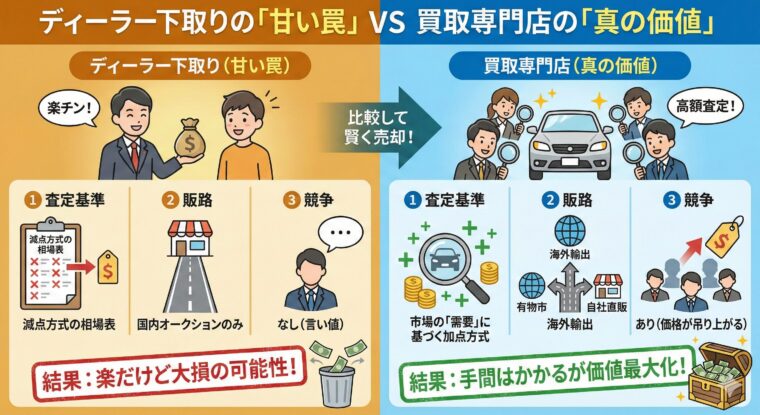 これでは「やめた方がいい」と言われるのも無理はありません。しかし、だからといってディーラーの下取りに任せてしまうのは、「楽」と引き換えに大損をしている可能性が極めて高いのです。