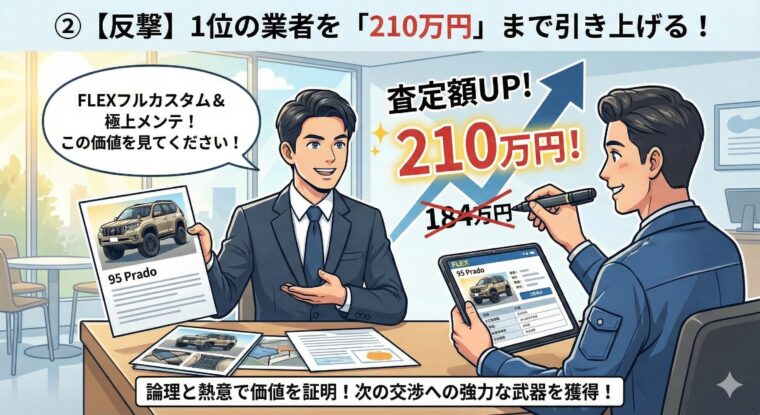 しかし、私は1位にランクインした買取業者とコンタクトを取り、実車査定を依頼しました。 「FLEXでフルカスタムされ、1年間大切にメンテナンスしてきた個体であること」を論理的に説明し、粘り強く交渉。その結果、当初184万円が上限だった提示額を、210万円まで引き出すことに成功しました。この「210万円」という数字が、次の交渉への強力な武器になります。