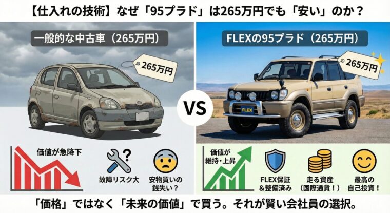 私が95プラドを265万円で購入したとき、周囲からは「30年前の車にそんな大金を……」と驚かれました。しかし、ビジネス開発に携わる者として、私は「購入価格」ではなく「将来の換金性」を見ていました。
