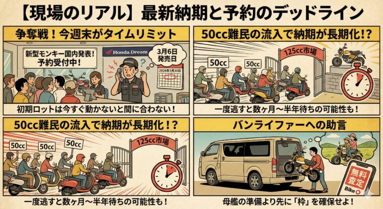 今回の新型から状況が変わった最大の要因は、2025年11月の50cc原付の生産終了です。 「これまではモンキーに興味がなかった層や、50ccからの乗り換えを余儀なくされたユーザーが、一気に125ccへ流れてきています。その影響で、一度初期ロットを逃すと、次の入荷が数ヶ月〜半年先まで飛んでしまう可能性が非常に高いです」 まさに、125cc市場がかつてないほど「密」になっているのが、2026年のリアルです。