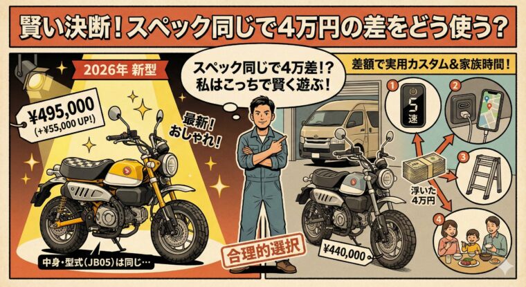 【見積明細公開】2026年式発表の裏で「2025年式モンキー125」を即決した理由。4万円の差をカスタムに回す賢い選択。