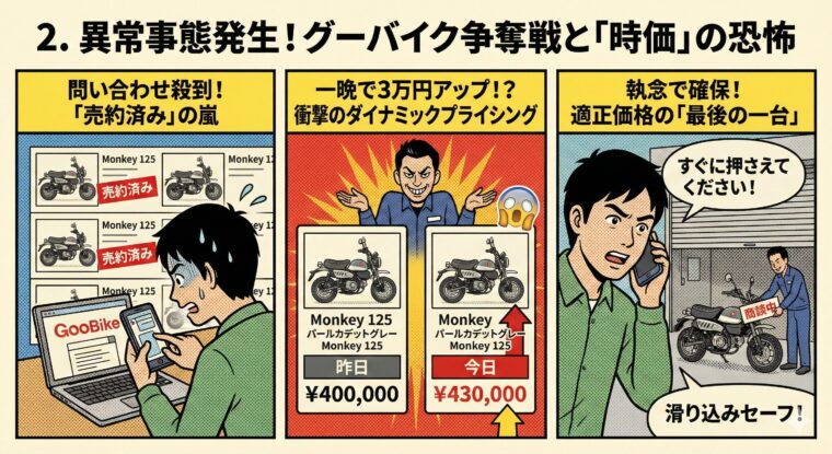 まさに、欲しいと思った瞬間が最安値。バイク業界にも、これほどまでにシビアな「時価」の波が押し寄せているのだと痛感しました。
