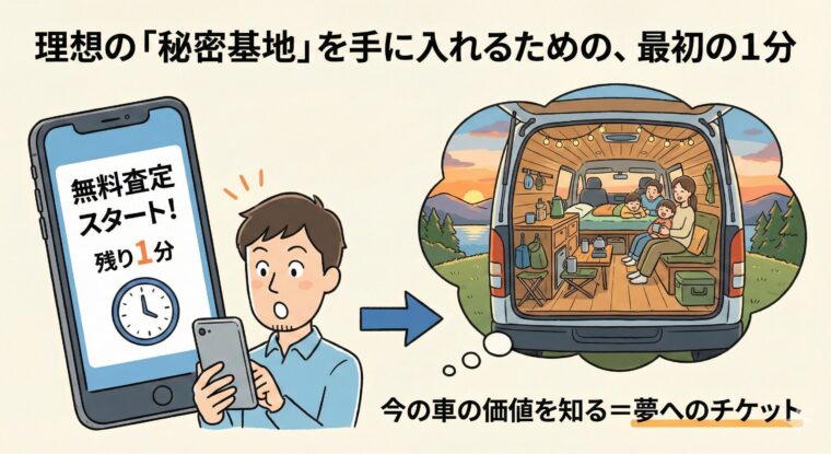 そう思った瞬間が、あなたのバンライフへのスタート地点です。まずはスマホでサクッと「本当の価値」を把握してみてください。その差額があれば、欲しかったポータブル電源や、憧れの内装カスタム費用がすべて賄えてしまうかもしれませんよ。