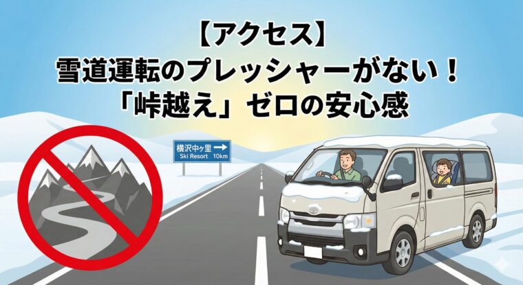【アクセス】雪道運転のプレッシャーがない!「峠越え」ゼロの安心感