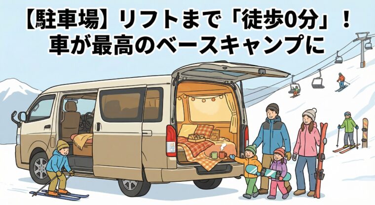 【駐車場】リフトまで「徒歩0分」!車が最高のベースキャンプに